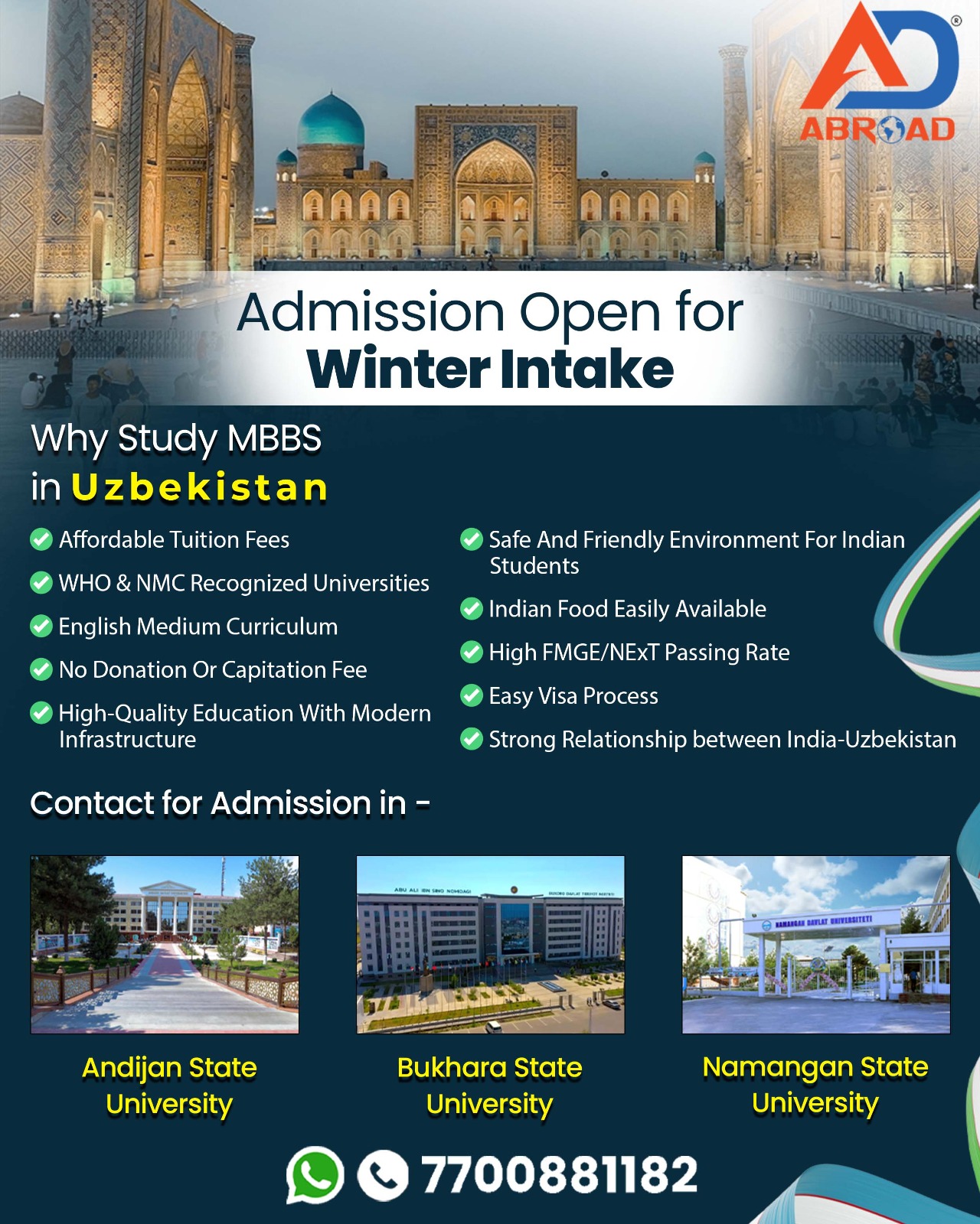 Admissions are now open for MBBS Winter Intake in Uzbekistan for Indian students. Uzbekistan has emerged as a preferred destination for MBBS abroad due to affordable tuition fees, WHO & NMC-recognized universities, English-medium curriculum, and no donation or capitation fees.